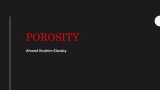 Porosity refers to the pore space within a rock that can be occupied by fluids like water or gas. It is calculated as a percentage by dividing the pore volume by the total bulk volume of the rock. There are different types of porosity depending on when and how the pore space was formed. Porosity can be measured directly using core samples in a lab or indirectly using well logging tools. An example calculation is provided to illustrate determining porosity from measurements of a rock core sample's dimensions and vacuumed pore volume.