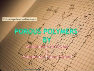 The document discusses porous polymers, covering their morphology, types, properties, and synthesis methods. It highlights micro porous, macro porous, and high internal phase emulsion (HIPE) structures, their pore sizes, and applications in fields like chromatography and vaccine preparation. Additionally, it emphasizes the role of porous polymers in environmental applications, such as oil spill control.