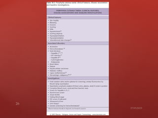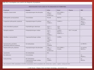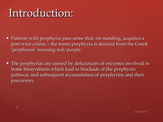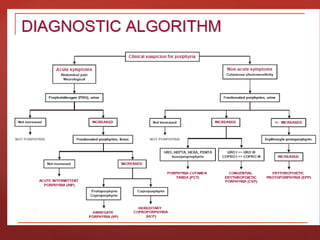Porphyria is caused by deficiencies in enzymes involved in heme biosynthesis, leading to accumulation of porphyrins and their precursors. There are several types of porphyria classified by enzyme deficiency, symptoms, or origin of excess precursors. Acute porphyrias involve neurologic or abdominal symptoms, while cutaneous porphyrias cause skin problems when exposed to sunlight. Porphyria results from partial deficiencies in enzymes that are sufficient under normal conditions but can be exacerbated by external factors, causing intermediates to accumulate and spill over.