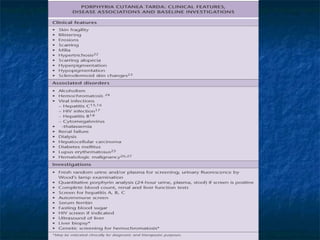 The document summarizes information about Porphyria Cutanea Tarda (PCT), including: