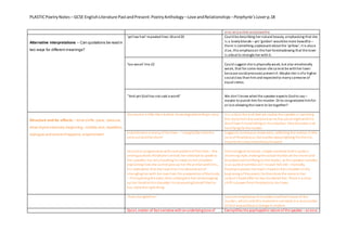 This document provides an in-depth analysis of the poem "Porphyria's Lover" by Robert Browning. It examines the poetic devices, form, structure, imagery, tone, and context of the work. The analysis notes that the poem tells the story of a psychopath calmly murdering his lover through its use of an unusual rhyme scheme, dramatic monologue form, and disturbing yet calm narrative voice. It also explores how the poem reflects Victorian social attitudes and Browning's interest in exploring twisted psychology through his dramatic monologues.