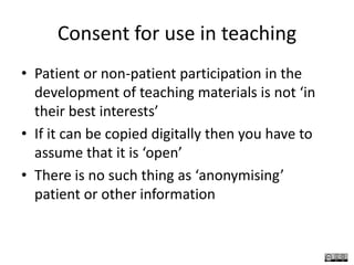 The document discusses the use and creation of Open Educational Resources (OER) in healthcare education, emphasizing the need for flexible, localized implementation and the importance of addressing intellectual property rights and consent issues. Recommendations include establishing clear policies for sharing resources and obtaining permissions, as well as advocating for open access to enhance educational quality and collaboration. Additionally, it explores the legal and ethical implications of using patient recordings in educational materials and the need for robust consent frameworks.