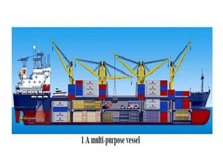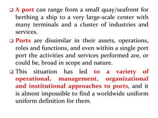 Ports serve critical roles as interfaces between sea and land transport and as economic hubs. They facilitate the transfer of freight and people via maritime transport connections to other modes. Ports range significantly in their assets, operations, and functions but generally serve as nodes in multimodal transport networks and distribution centers. Their planning requires balancing economic, engineering, and supply chain concerns over short, medium, and long time horizons. Key port activities involve vessel berthing and cargo handling, while port classifications depend on factors like hinterland served and shipping services provided.