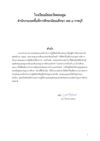 Corel Draw x๔ เรื่อง ความรู้ เบื้องต้นเกี่ยวกับการออกแบบกราฟิก ระดับชั้นมัธยมศึกษาปีที่ ๓ มีประสิทธิภาพ ๘๑.๓๒/๘๑.๑๔ ผลสัมฤทธิ์ทางการเรียนโดยเฉลี่ยก่อนเรียนและหลังเรียนมัลติมีเดียด้วยโปรแกรม Corel Draw x๔ เรื่อง การ ออกแบบกราฟิก ระดับชั้นมัธยมศึกษาปีที่ ๓ แตกต่างกันอย่างมีนัยสาคัญทางสถิติที่ระดับ .๐๕ และ กลุ่มเปูาหมายมีความพึงพอใจต่อการจัดการเรียนรู้โดยใช้ชุดการสอนอยู่ในระดับพึงพอใจมากที่สุด ลงชื่อ ผู้รายงาน ( นายอารมย์ อินทรประเสริฐ ) ตาแหน่ง ครูชานาญการ โรงเรียนมัธยมวัดดอนตูม บันทึกความคิดเห็น ข้อเสนอแนะของผู้ตรวจรายงาน ................................................................................................................................................................ ................................................................................................................................................................ ................................................................................................................................................................ . ลงชื่อ.........................................ผู้ตรวจรายงาน (ดร.เกศสุดา เนรมิตธนไพศาล ) ผู้อานวยการโรงเรียนมัธยมวัดดอนตูม