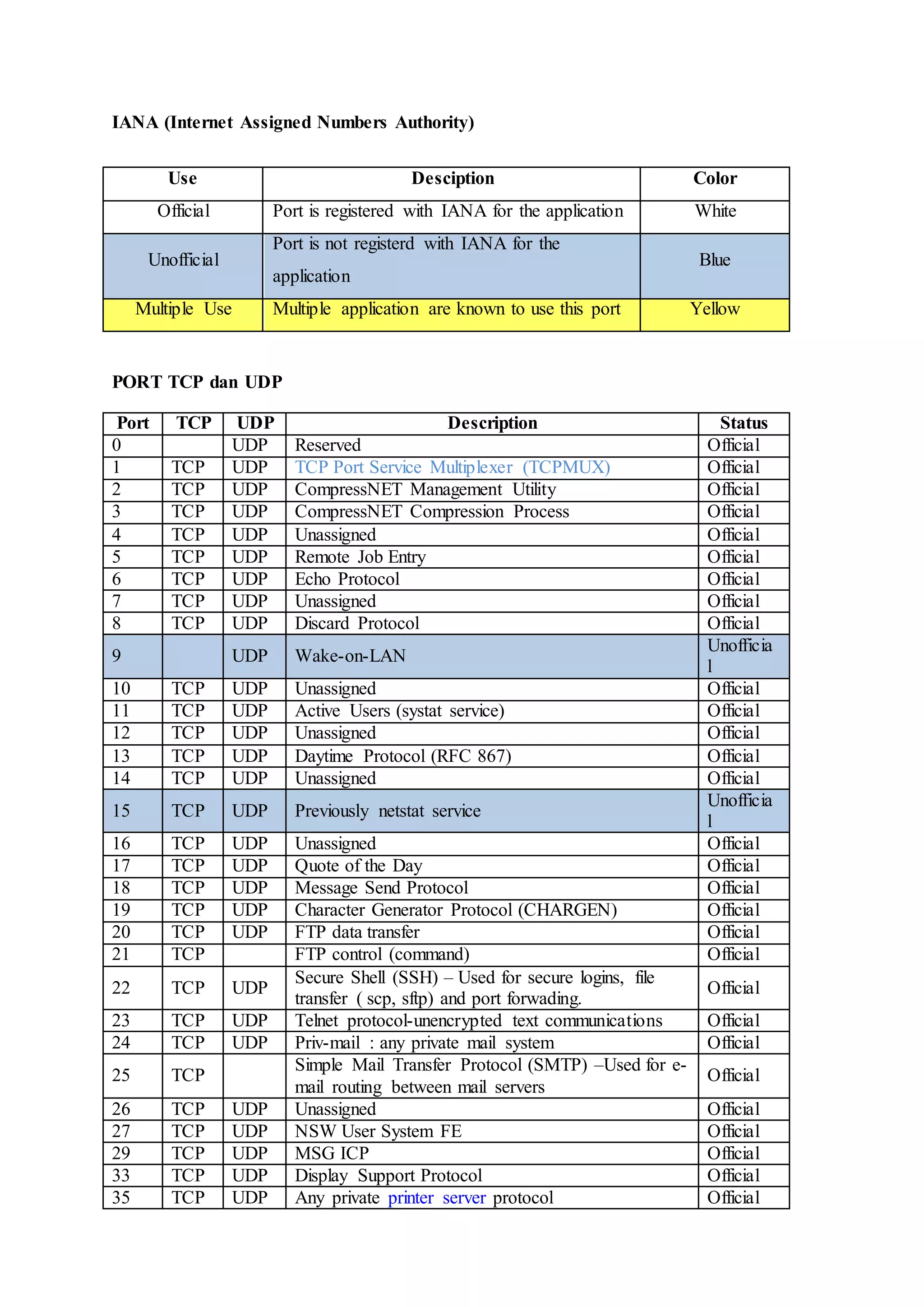 This document lists TCP and UDP ports along with their descriptions and status. It provides information on common ports used for protocols like HTTP, DNS, SSH, SMTP, and more. The status is categorized as official, unofficial, or multiple use to indicate if the port is registered with IANA for a specific application, not registered, or can be used by multiple applications.