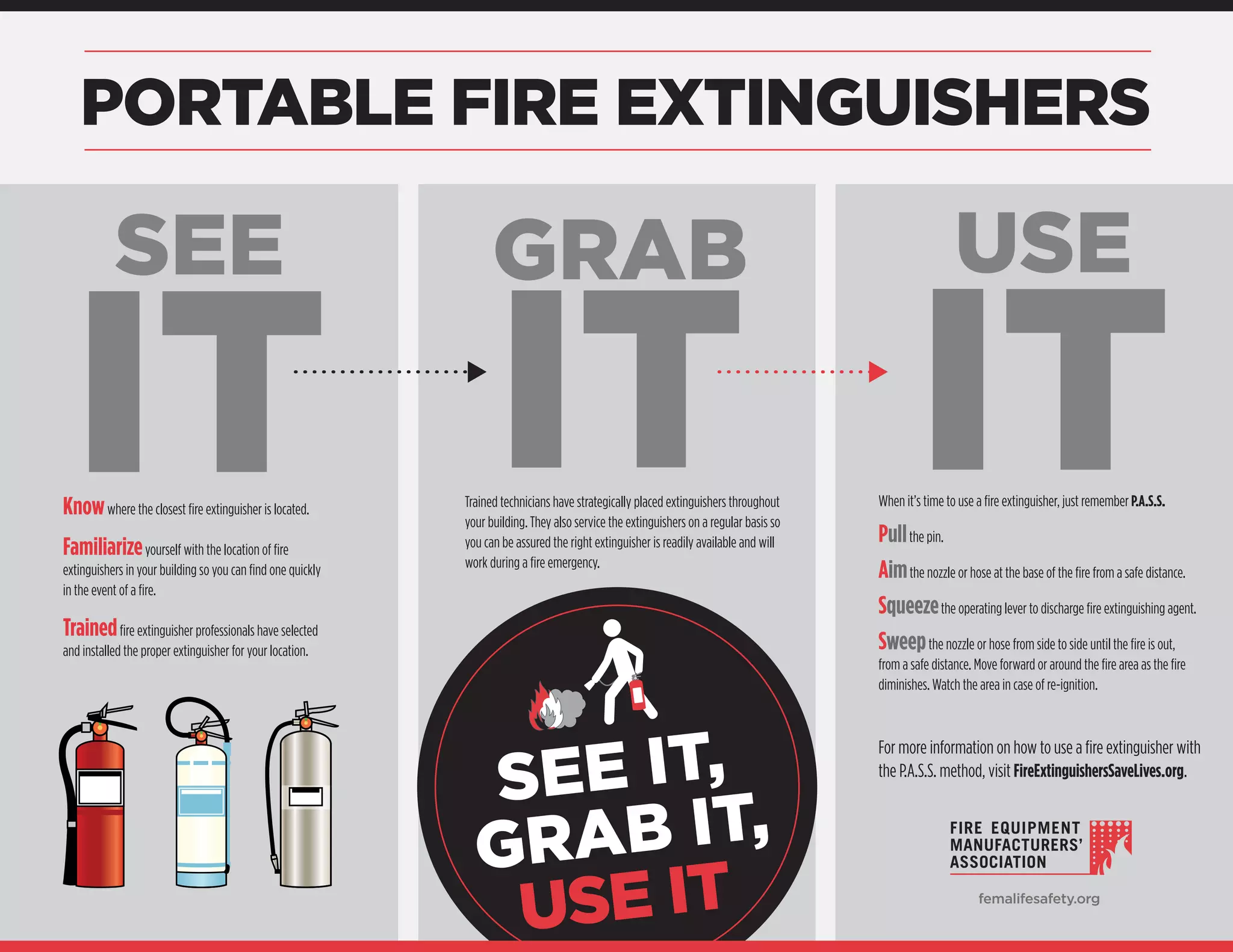 The document provides instructions for using a portable fire extinguisher with the P.A.S.S. method: Pull the pin, Aim at the base of the fire from a safe distance, Squeeze the lever to discharge the agent, Sweep from side to side until the fire is out while moving around the fire area as it diminishes. It also recommends familiarizing yourself with fire extinguisher locations and trained professionals have selected, installed, and placed the proper extinguishers which are regularly serviced.