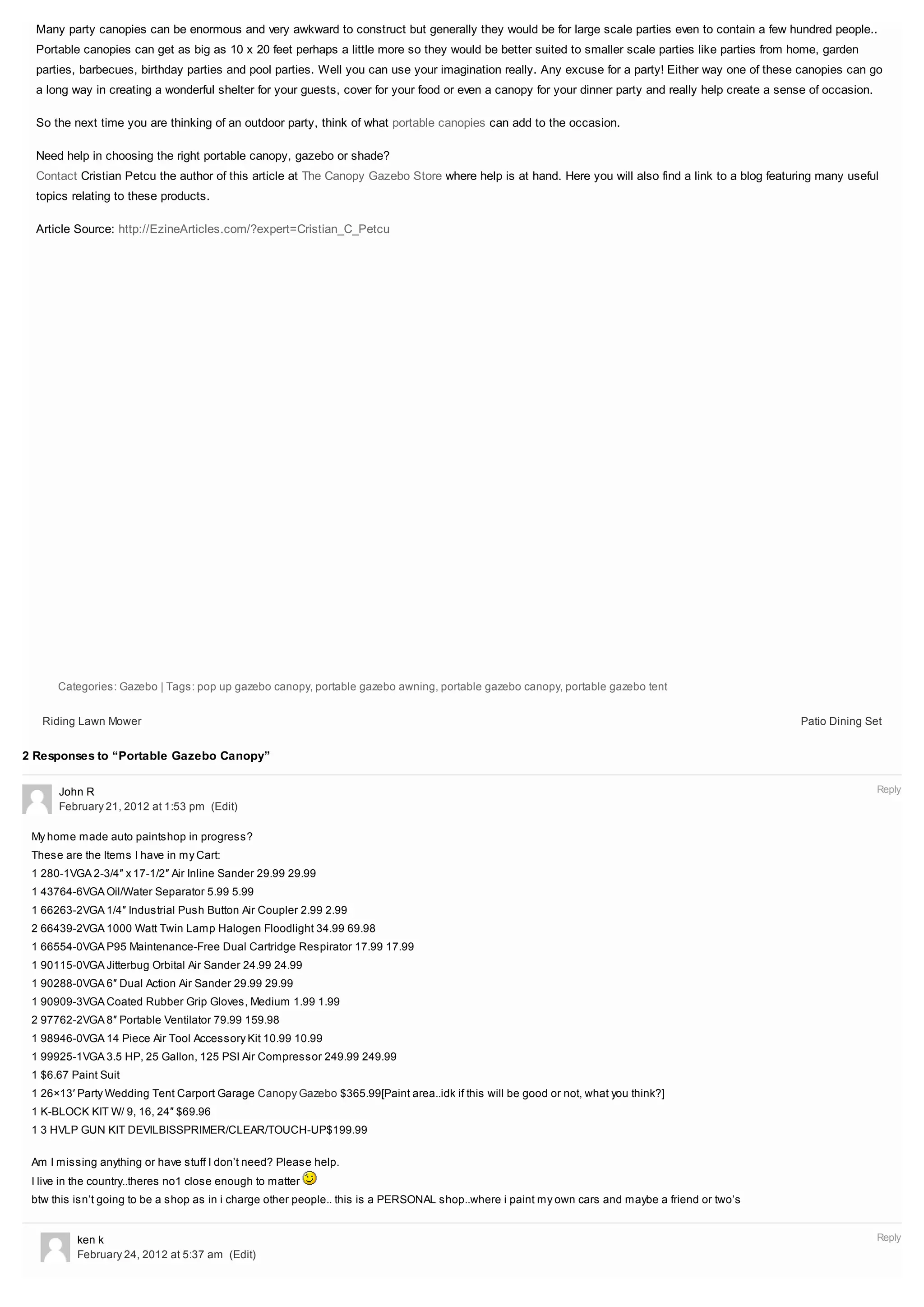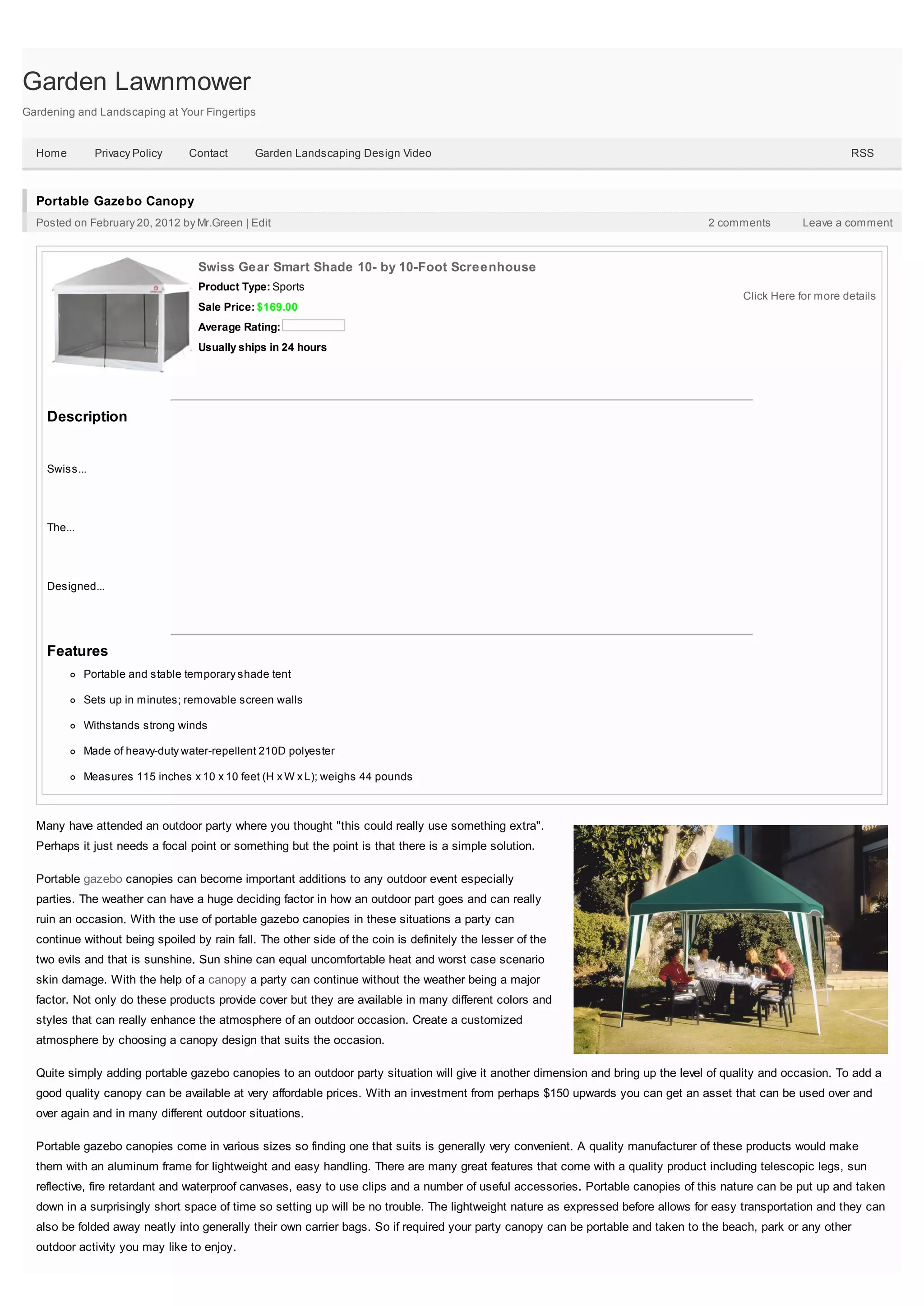 The document discusses portable gazebo canopies and their benefits for outdoor parties and events. It describes a 10x10 foot portable gazebo canopy product, noting its features like being portable, water resistant, and easy to set up. It explains how gazebo canopies can protect parties from weather like rain or sun, and allow events to continue comfortably outside. The document recommends gazebo canopies for enhancing outdoor gatherings and creating a customized atmosphere. It also provides contact information for a company that sells portable canopy and gazebo products.
