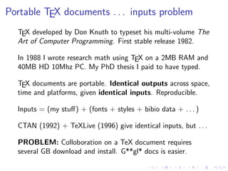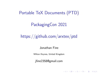 The document discusses the development and challenges of Portable TeX Documents (PTD), created to facilitate collaboration and reproducibility in typesetting using TeX. It addresses issues like the significant download size for required dependencies and proposes solutions such as caching and using git archives to optimize resource management. The author shares future plans for the PTD, including collaboration with projects aimed at improving secure hash technologies and enhancing usability in upcoming years.