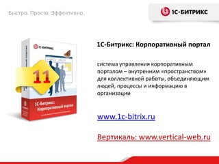 Документ описывает функциональные возможности корпоративного портала 1С-Битрикс, предназначенного для управления внутренними процессами компании, повышая эффективность работы сотрудников. Портал включает инструменты для коллективной работы, автоматизации бизнес-процессов, управления документами и коммуникаций, обеспечивая оперативное взаимодействие между сотрудниками и улучшая корпоративную культуру. Среди его возможностей — учет рабочего времени, управление задачами, видеоконференции, а также интеграция с внешними системами и приложениями.