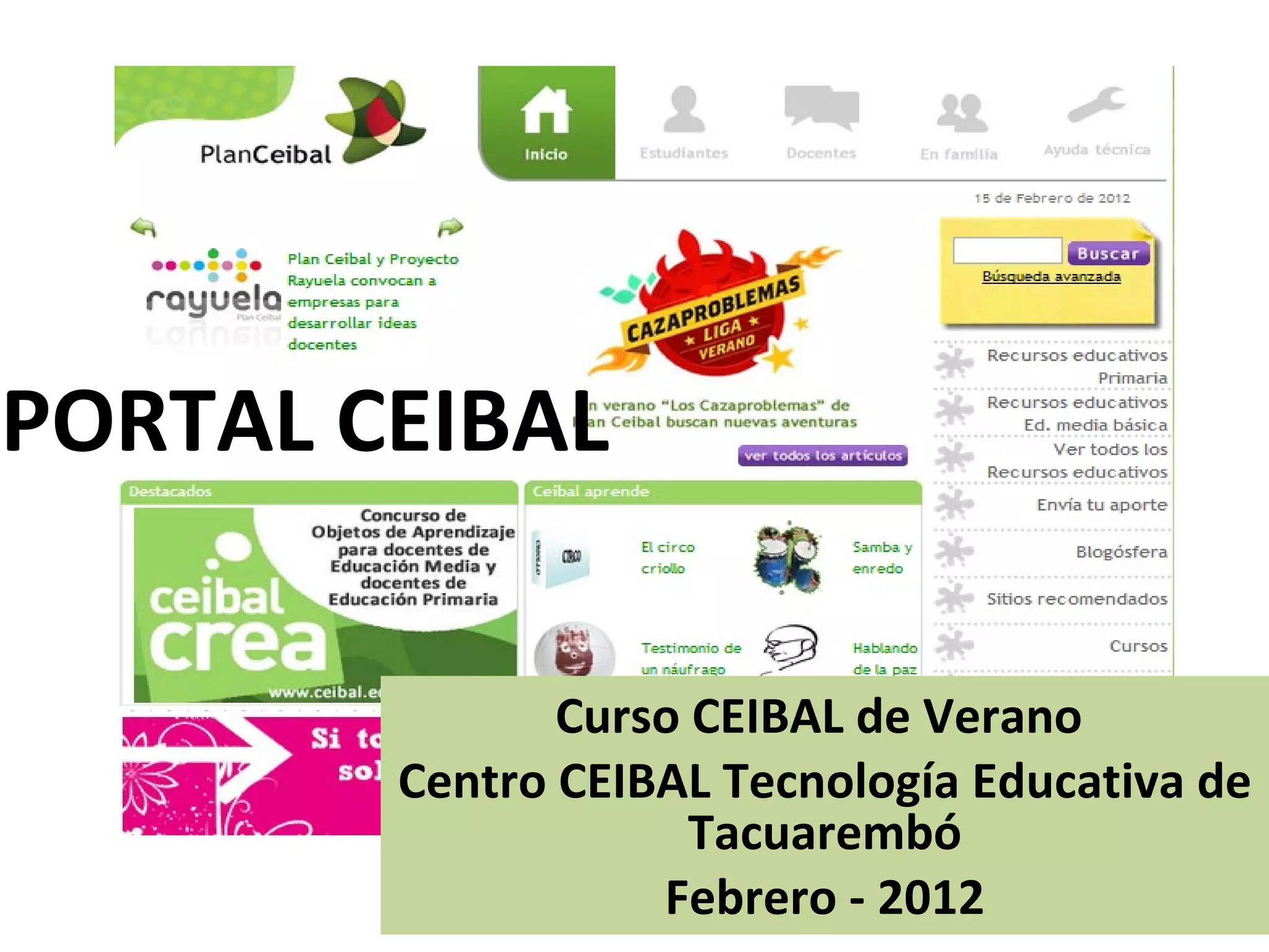 Este documento presenta el portal educativo CEIBAL y sus diferentes secciones, incluyendo escritorios para estudiantes, docentes y familias, así como ayuda técnica. Se ingresa al área de Educación Artística, la cual contiene un número creciente de recursos, entre los cuales se encuentra el recurso titulado "A la caza del Candombe" que puede ser visualizado o descargado online.