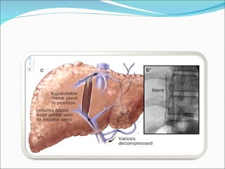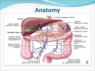 This document summarizes information about portal hypertension and variceal bleeding. It discusses the causes of portal hypertension including pre-sinusoidal, sinusoidal and post-sinusoidal factors. It also describes treatments for acute variceal bleeding such as pharmacologic therapies, endoscopic therapies like band ligation, balloon tamponade and TIPS. It notes that prevention of recurrent bleeding involves pharmacotherapy, endoscopic therapy, TIPS or surgical options like portosystemic shunts or liver transplantation.