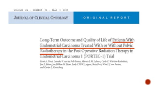 1) The PORTEC-1 and PORTEC-2 trials compared pelvic radiotherapy to no additional treatment or vaginal brachytherapy for patients with endometrial carcinoma. PORTEC-1 found pelvic radiotherapy reduced vaginal recurrence while PORTEC-2 found vaginal brachytherapy achieved excellent vaginal control with fewer side effects compared to pelvic radiotherapy.