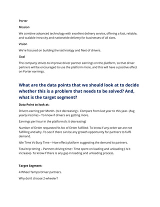 The document outlines strategies for increasing earnings of driver partners at Porter by addressing various challenges they face, focusing primarily on 4-wheeler tempos. Key recommendations include enhancing delivery efficiency, exploring advertising revenue through vehicle branding, and incentivizing drivers to operate in high-demand areas. Success metrics will track changes in driver income and new advertising inquiries while managing associated risks and trade-offs.