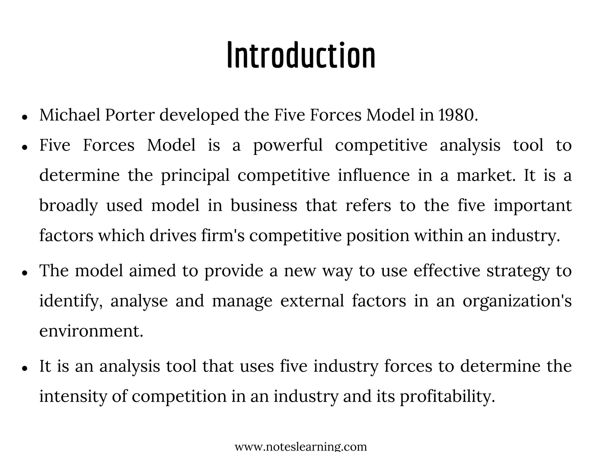 Michael Porter developed the Five Forces Model in 1980 to provide a new way to analyze and manage external competitive factors that influence an organization's profitability. The model examines five forces: the threat of new entrants, the bargaining power of suppliers and buyers, the threat of substitutes, and the intensity of rivalry among existing competitors. Analyzing these forces helps organizations identify their competitive position in an industry and shape effective business strategies accordingly.