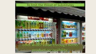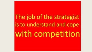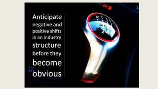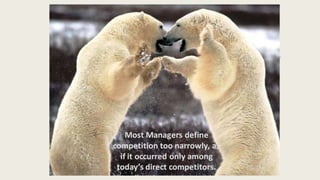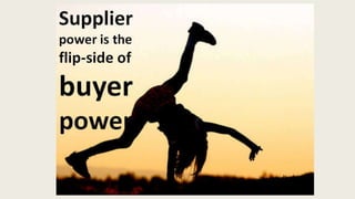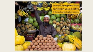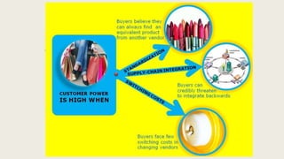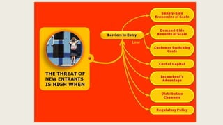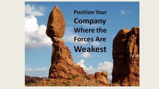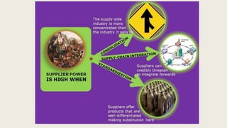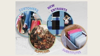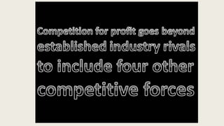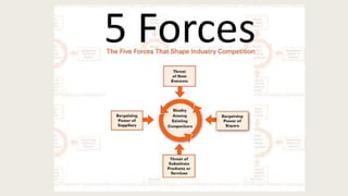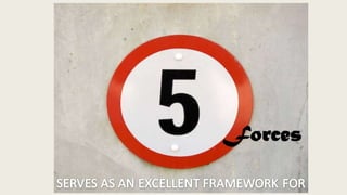 Porter's Five Forces model analyzes five competitive forces that determine the profitability and attractiveness of an industry. The five forces are: the threat of new entrants, the bargaining power of suppliers, the bargaining power of buyers, the threat of substitutes, and competitive rivalry within an industry. The model helps understand where power lies in a business situation and assess the strength of a company's competitive position.
