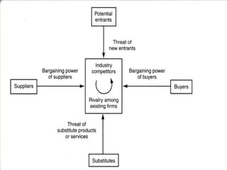 The document discusses Porter's five forces model as it applies to the apparel industry. It analyzes the competitive intensity and profitability of the industry by looking at the barriers to entry, power of suppliers and buyers, threat of substitutes, and rivalry among existing competitors. The summary is: