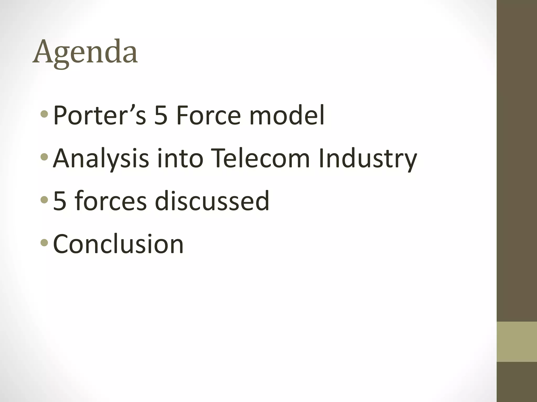The document analyzes the telecommunication industry in India using Porter’s Five Forces model, highlighting key competitors, market share, and future prospects. Major players like Airtel, Reliance, and Idea dominate the market, with Airtel leading in market share and revenue. It concludes that the sector is experiencing growth and profitability, with substantial competition among operators and increasing consumer demand for connectivity.