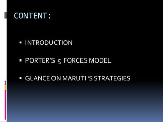 The document analyzes Maruti Suzuki's position using Porter's Five Forces model, highlighting its market leadership in the Indian automotive sector since its establishment in 1982. It discusses the competitive landscape, including threats from new entrants, rivalry within the industry, and shifting consumer expectations, while emphasizing the company's strategies to enhance operational efficiency and expand its product offerings. Key strategies include upgrading manufacturing facilities, broadening the product portfolio, and venturing into related businesses to maintain market competitiveness.