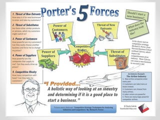 The document discusses Michael Porter's Five Forces model for analyzing competitive structure in industries. The model assesses the long-term attractiveness of industries by examining five competitive forces: the threat of new entrants, the threat of substitutes, rivalry among existing firms, bargaining power of buyers, and bargaining power of suppliers. A sixth force of other stakeholders was later added. Each force is influenced by several factors like barriers to entry, switching costs, number of competitors and substitutes. The model helps understand industry dynamics but provides just a snapshot and does not capture all complexities or account for corporate social responsibility.