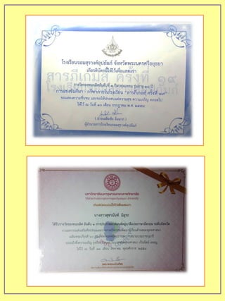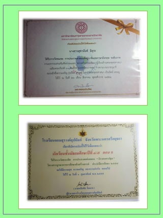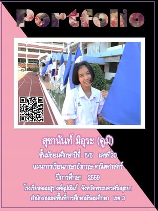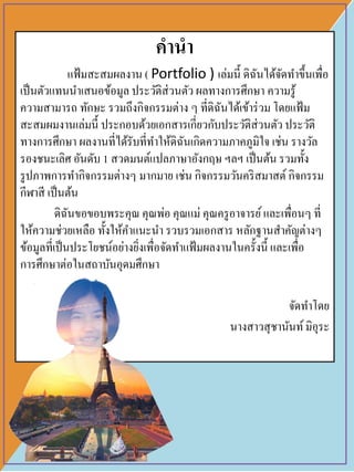 ) เล่มนี้ ดิฉันได้จัดทาขึ้นเพื่อ เป็นตัวแทนนาเสนอข้อมูล ประวัติส่วนตัว ผลทางการศึกษา ความรู้ ความสามารถ ทักษะ รวมถึงกิจกรรมต่าง ๆ ที่ดิฉันได้เข้าร่วม โดยแฟ้ม สะสมผมงานเล่มนี้ ประกอบด้วยเอกสารเกี่ยวกับประวัติส่วนตัว ประวัติ ทางการศึกษา ผลงานที่ได้รับที่ทาให้ดิฉันเกิดความภาคภูมิใจ เช่น รางวัล รองชนะเลิศ อันดับ 1 สวดมนต์แปลภาษาอังกฤษ ฯลฯ เป็นต้น รวมทั้ง รูปภาพการทากิจกรรมต่างๆ มากมาย เช่น กิจกรรมวันคริสมาสต์ กิจกรรม กีฬาสี เป็นต้น ดิฉันขอขอบพระคุณ คุณพ่อ คุณแม่ คุณครูอาจารย์และเพื่อนๆ ที่ ให้ความช่วยเหลือ ทั้งให้คาแนะนา รวบรวมเอกสาร หลักฐานสาคัญต่างๆ ข้อมูลที่เป็นประโยชน์อย่างยิ่งเพื่อจัดทาแฟ้มผลงานในครั้งนี้ และเพื่อ การศึกษาต่อในสถาบันอุดมศึกษา จัดทาโดย นางสาวสุชานันท์มิอุระ