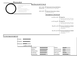 The document appears to be a resume for an individual named Omar Mohamed Hazem Osman. It includes biographical information like name, date of birth, nationality, contact information. It also lists his educational qualifications and experiences, including a Master's degree in Architecture Typology from Technische Universtät Berlin and internships. It provides details of languages spoken and design software skills. Finally, it outlines exhibitions and projects he has worked on.