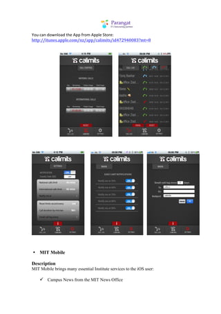 The document describes several iOS and Android applications. For iOS, applications include the World Youth Alliance app, Calimits call monitoring app, MIT Mobile campus services app, KnotSpot knot learning app, Goear music streaming app, and jewelry catalog apps. For Android, applications include a QR code scanner, iLoveNote couple sharing app, and Residential Deal Analyzer real estate investment app. Each application is summarized with its purpose and download link. The document also provides screenshots and descriptions of the features developed for some of the apps.