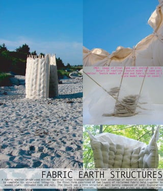 The document is Nicole LeBlanc's design portfolio and curriculum vitae. It includes summaries of several design projects she completed during school including a fabric earth structure, a community center, and a natural birth and death center. It also lists her education, employment history, skills, experience, and references.