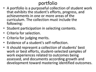 A portfolio is a collection of a student's work that shows their progress and achievements. It should include student-selected samples, criteria for selection, evidence of self-reflection, and represent their best work.