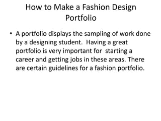 Creating a fashion design portfolio requires including sketches, fabric swatches, photos of finished designs, and organizing samples in a logical order to tell a story. A digital copy should also be scanned.