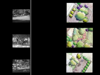 The document contains sketches of a mountain, banana tree, and oak tree done with different mediums. It also includes an axonometric drawing of an apartment complex near UC Davis with verdant plant life, and close-ups of the drawing and site photos. Additionally, it describes a sculpture for outside Briggs Hall showing its dimensions and needing planter removal, and a plan and section rendering of the UC Davis Arboretum in fall colors with close-ups and a site photo.