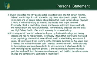 Jonathan Moretti completed his undergraduate degree in psychology in 2009. He became interested in psychology after taking a high school psychology course. He went on to take many psychology courses in college to learn more about the field. After working for several years in mortgage, he realized he wanted a career change to psychology. He is now looking to enter the field and gain experience working with children. His long term goals are to get a master's degree and possibly a PhD to become a high school guidance counselor to help students in a way he felt he lacked support as a youth.