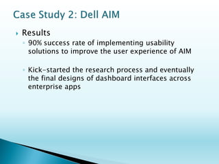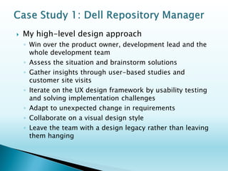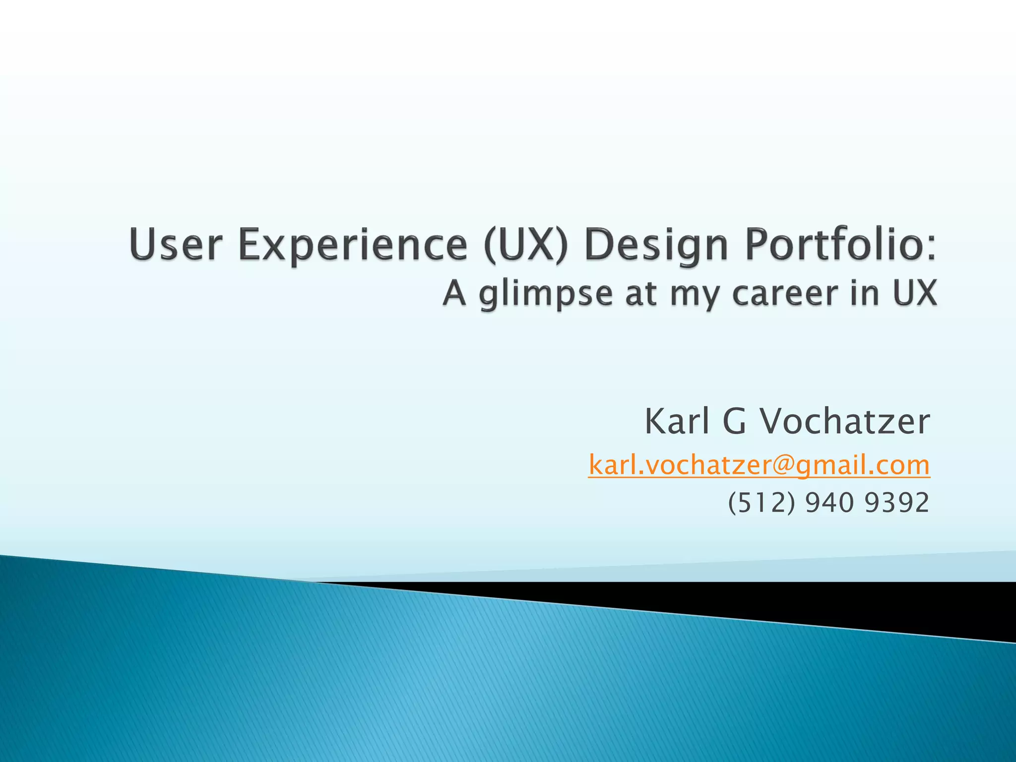 This document contains the resume of Karl G Vochatzer. It summarizes his 20 years of experience in user-centered design, with an emphasis on browser and Windows-based enterprise applications. It details his work at various companies, including Dell, where he led projects to redesign interfaces and improve the user experience of several applications. Colleagues comment positively on his leadership, collaborative approach, and focus on improving usability.