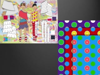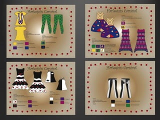 This portfolio document summarizes Patrick Kemp's fashion design work from multiple classes. It includes final projects and collections for classes in Fashion Design I, Swimwear, Children's Wear, Presentation Techniques, Fashion Drawing II, Fashion Illustration, Painting I, Design I, and Batik. The projects covered a variety of genres and were inspired by artists like Mondrian, Miro, Bowie, Klimt, and styles like Oriental artwork, candy, and Fauvism. Samples shown include designs, illustrations, a self-portrait, and a batik scarf.