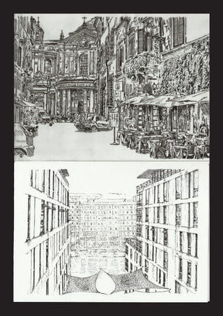 This document provides a portfolio summary of Eugene Peng, a graduate of the Foundation in Natural and Built Environment program who is pursuing a career in architecture. It includes examples of his earliest design works from "Falling Sky" and projects completed in the program from April 2013 to February 2014, including orthographic drawings, site plans, elevations, sections, and models for displaying toys based on the movie "Chicken Little".