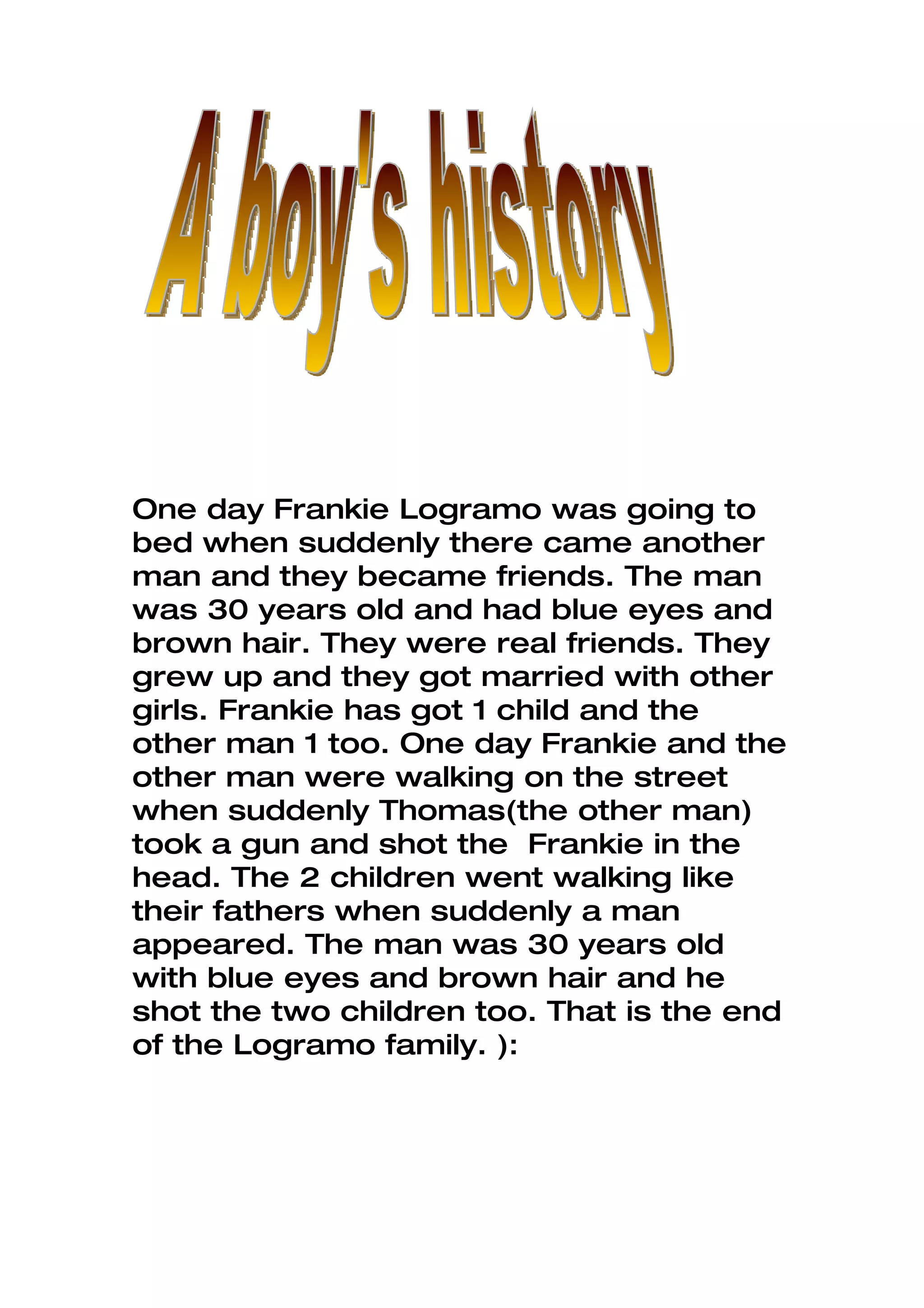 Frankie Logramo met a man named Thomas who became his friend. They both married other women and had children. One day, Thomas suddenly shot and killed Frankie with a gun. Years later, when their children were walking together like their fathers used to, a man matching Thomas's description also shot and killed the two children, ending the Logramo family line.