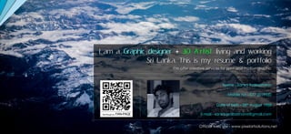 Sanka Prabashana provides their resume and portfolio highlighting their experience and skills in graphic design, 3D art, and motion graphics. They have over 8 years of experience working on print and digital designs for clients. Their resume lists positions at multimedia training centers and marketing companies where they designed advertisements, brochures, and online graphics. Samples of their work are provided showing designs for tea packaging, food packaging, and company branding.