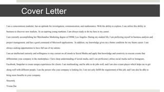 This document contains Yixian Dai's portfolio, which includes sections on resume, cover letter, math/buying, marketing, merchandise, and business/management. The portfolio showcases projects and skills developed in her Merchandise Marketing degree program including department analysis, buying strategies, marketing communications, trend analysis, and store merchandising presentations. It demonstrates Yixian Dai's qualifications for merchandise marketing roles through academic coursework and real-world applications of merchandising concepts.