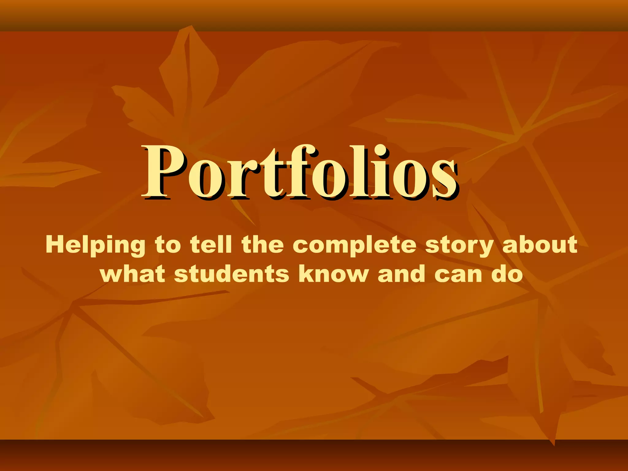 Portfolios provide a complete picture of student performance and learning over time. They include purposeful collections of student work, reflections, and feedback aligned to learning objectives. Rubrics help assess portfolio work objectively on a scale from novice to distinguished. Adding portfolios to current assessments will engage students in self-evaluation and document learning in all areas, while facilitating communication between teachers, students, and parents at conferences.