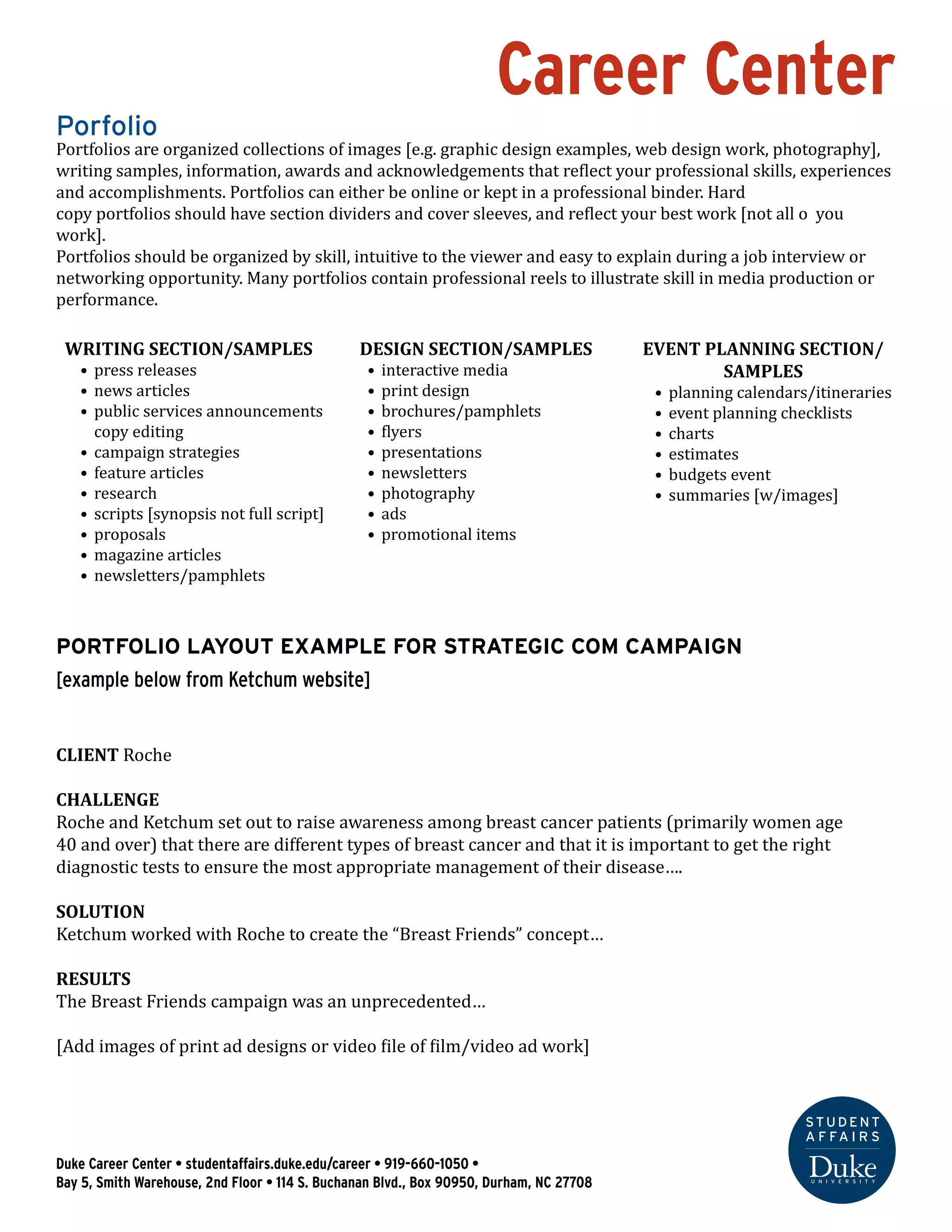 The document outlines the creation and organization of professional portfolios, which may include various sections for writing samples, design work, event planning, and media production to showcase skills and achievements. It emphasizes the importance of selecting high-quality work, providing context for each piece, and tailoring the portfolio to fit the desired industry. Furthermore, it offers specific portfolio piece suggestions for various fields, including journalism and strategic communications.