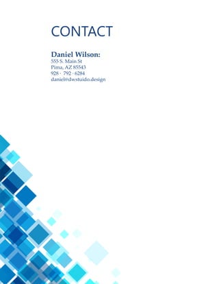 The document contains Daniel Wilson's portfolio, which includes various design projects like a brochure, montage, infographic, business card, invitation, magazine spread, Prezi presentation, logos, business identity, web page coding, and photo design. Each project includes a description, date, class/instructor details, programs/tools used, objectives, and process overview. The portfolio showcases Daniel's graphic design skills and range of abilities across different formats and mediums.