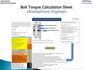 David Diaz is a mechanical engineer providing samples of his portfolio, including design engineering, a bolt torque calculation sheet, leading a DFSS project called "Low Cost Step" as a project leader and design engineer using PRO-E/Creo software. Additional samples include work on tooling, equipment and fixtures as a design engineer using SolidWorks, sheets metal parts, failure analysis of products, and go/no-go fixtures for checking product dimensions.