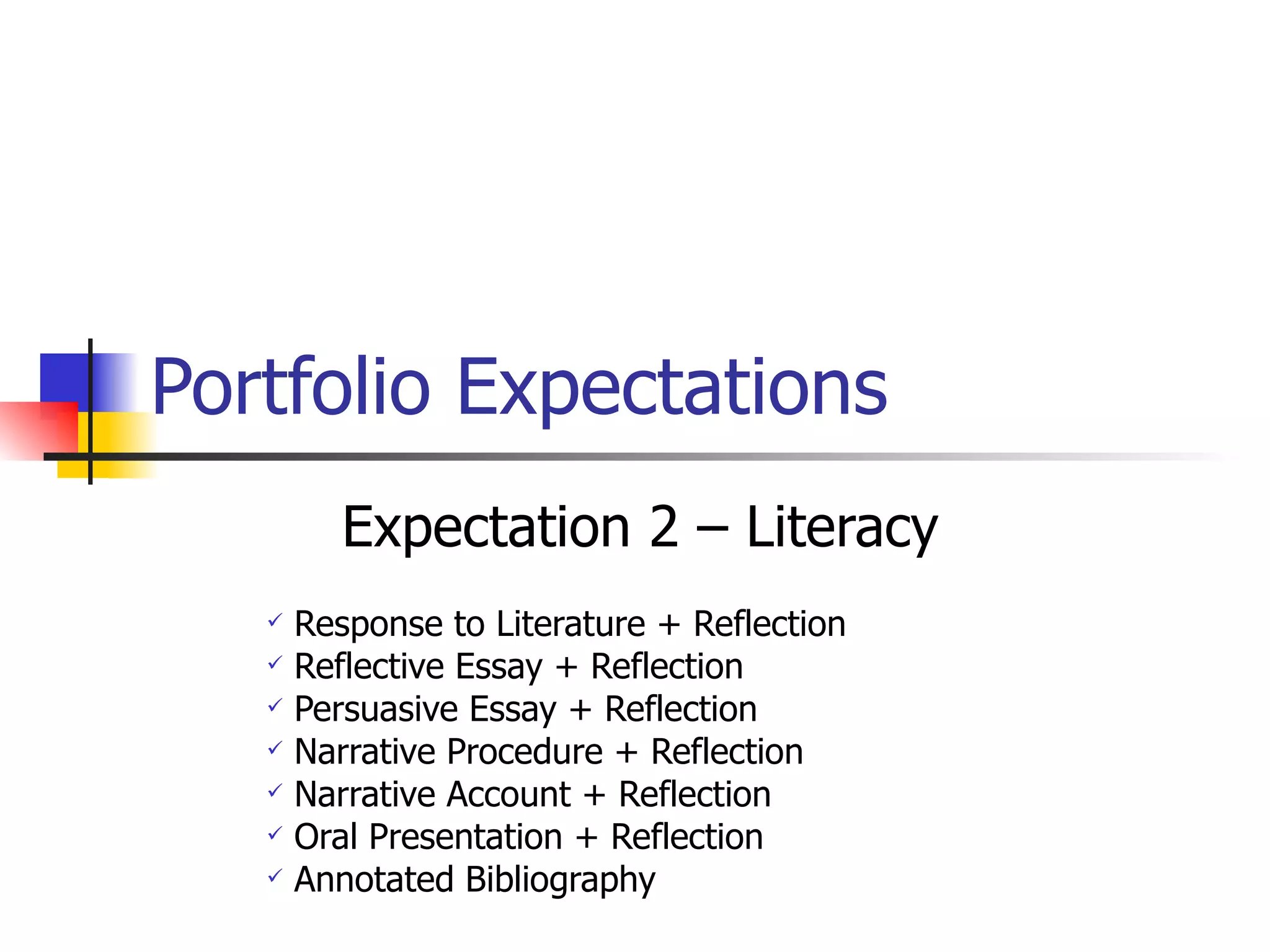 The document outlines portfolio expectations for an English course. It includes requirements for various assignments such as reflective essays, responses to literature, persuasive essays, and oral presentations. Students must meet a minimum rubric grade of 80 or higher for each assignment. If below that, revisions are required. The document also provides models and rubrics for referenced assignments to help students understand expectations and meet requirements.