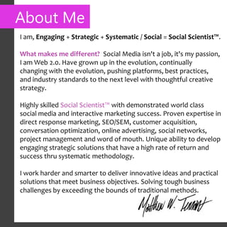 Matthew Tennant is a social media expert and social scientist with over 10 years of experience in social media strategy, marketing, and community management. He has helped numerous companies implement successful social media strategies to increase brand awareness and user engagement. Tennant is skilled in social listening, content creation, influencer engagement, and analyzing metrics to optimize social campaigns. He enjoys staying on top of emerging trends and technologies to continually improve clients' social media presence.