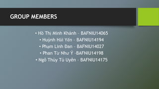 This document summarizes a student group project on portfolio theory and investment analysis. The group consists of 5 students and aims to create a portfolio targeting risk-seeking investors aged 25-40. The portfolio will be 100% invested in stocks listed on the HOSE exchange in Vietnam. Key points analyzed include macroeconomic factors, industries, individual stock selection, and performance evaluation metrics like the Treynor, Sharpe, and Jensen measures. 16 stocks were selected across various industries based on financial criteria. An evaluation of the 23-day trial portfolio found positive but modest performance.