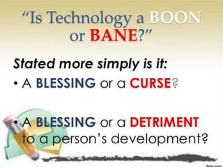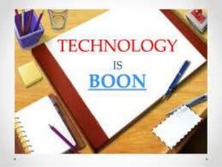 The document discusses educational technology and its role in learning. It defines educational technology and discusses how it can be both beneficial (boon) and detrimental (bane) when not used properly. It also describes a systematic approach to teaching using educational technology and how technology can play traditional and constructivist roles in learning. Specific concepts discussed include the cone of experience model, meaningful learning, discovery learning, generative learning, and constructivism. The document concludes that educational technology motivates students and allows for independent, visual, and kinesthetic learning as well as early development of research skills.
