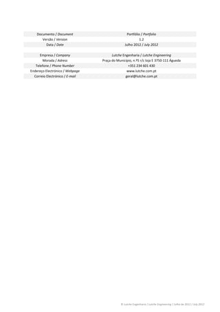 The document is a portfolio from Lutche Engenharia detailing various HVAC, electrical, and telecommunications projects completed by the company as of July 2012. It includes a list of projects such as schools, retirement homes, and office buildings, along with their respective sizes and locations. Additionally, it highlights services like energy audits and building simulations.