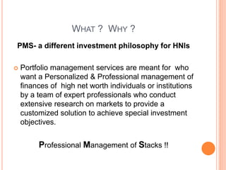 Portfolio management services are meant for high net worth individuals who want a personalized and professional management of their finances by a team of experts. PMS provides custom investment solutions and strategies through extensive research to achieve clients' investment objectives. It offers higher returns than mutual funds through concentrated portfolios of 18-25 stocks that are closely monitored and rebalanced regularly. Fees for PMS include upfront fees of 2% of assets and performance fees of up to 20% of returns above 10%. The minimum investment amount is 25 lakhs for a minimum suggested holding period of 3 years.