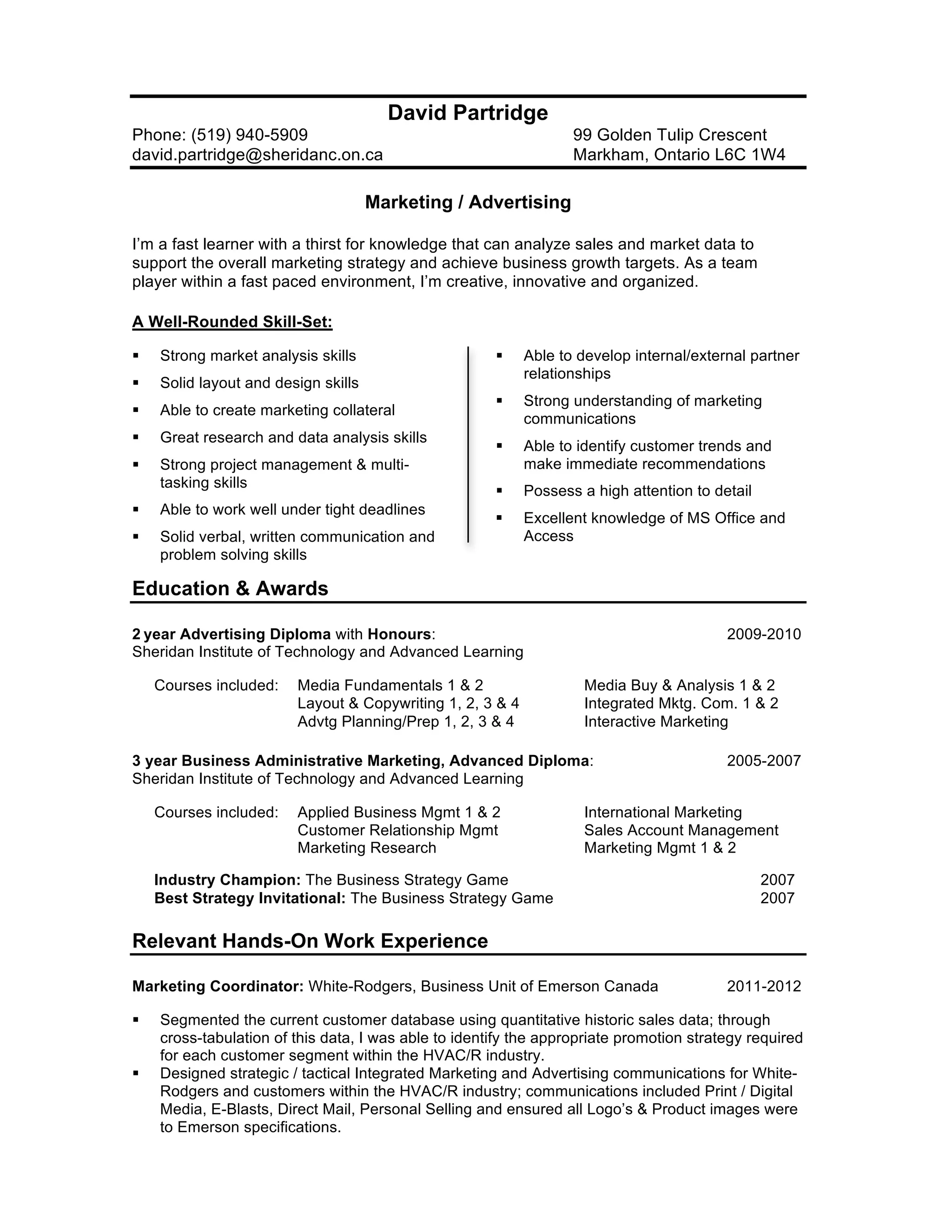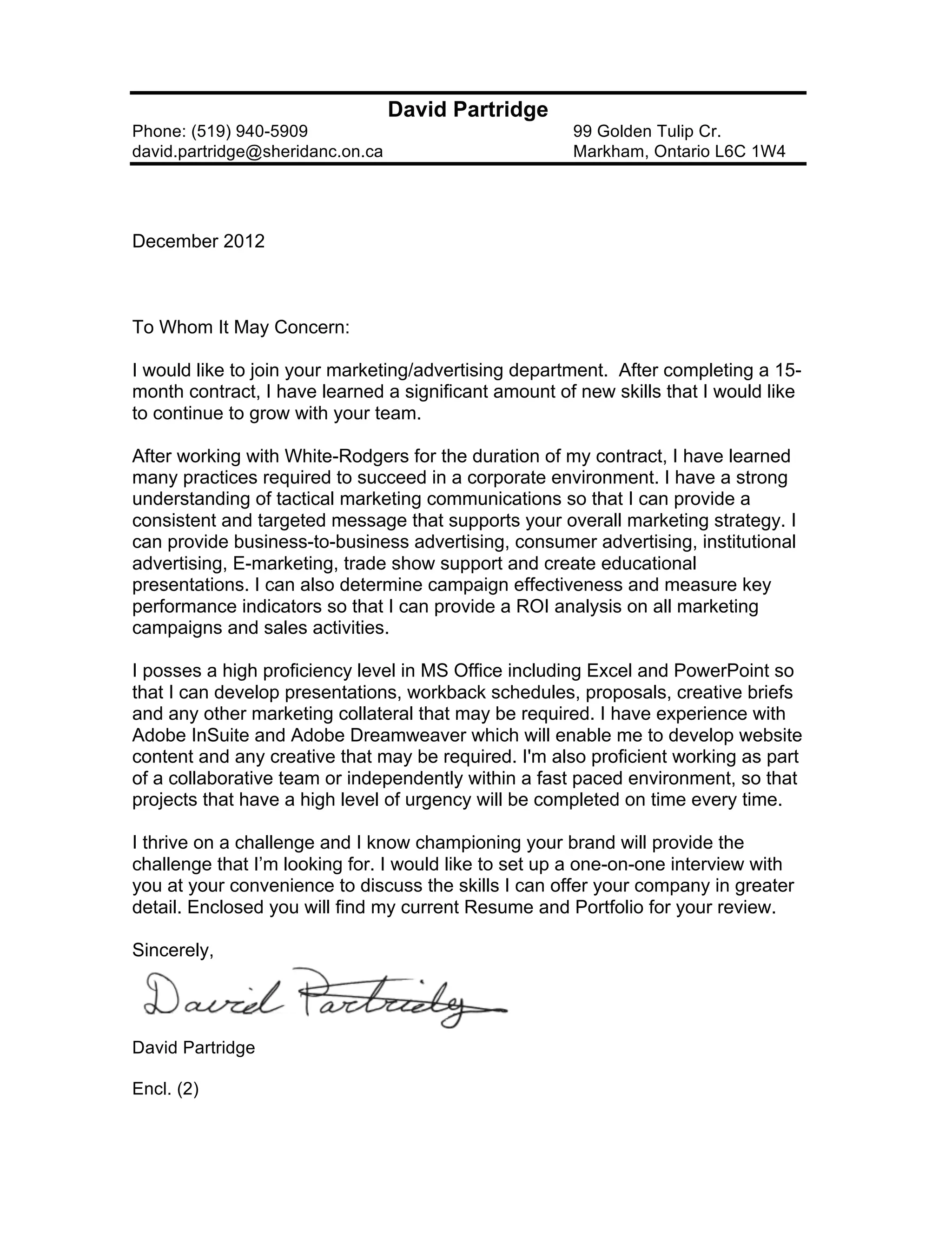 David Partridge is seeking a position in the marketing/advertising department, leveraging skills gained during a 15-month contract at White-Rodgers. He has a thorough understanding of tactical marketing communications, experience analyzing market data, and proficiency in MS Office and Adobe tools. Partridge emphasizes his ability to work both collaboratively and independently in fast-paced environments, and expresses a desire for a one-on-one interview to discuss his qualifications further.
