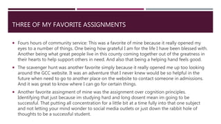 - Her favorite assignment was 4 hours of community service, which opened her eyes to how grateful she is for her life and seeing people coming together to help others.