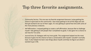 Kaitlin Williams is studying General Studies and aims to study 4 hours per day for the rest of the semester. Her top assignments included community service at an animal shelter, creating a self-affirmation, and a journal entry that helped her dialogue with her inner self. Her favorite journal entries helped her identify what was holding her back and show her integrity. She most enjoyed the Financial Literacy and Self-Motivation module because it helped her find motivation to complete her work. Lessons she will take forward include time management, deep learning, and staying on top of assignments. Her self-assessment scores showed areas of growth in self-management, interdependence, and self-awareness. Her goal is to be a fashion designer